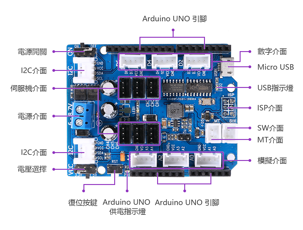 - 直接兼容 Arduino UNO 介面,無需其他引線
